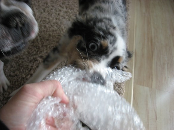 Des watched Angus, then rocketed my way and latched onto a wad of the little bubble wrap I had in my hand. He was a maniac, tugging harder than he ever has, towing me around the room. It’s definitely not stuff you want to leave the pups alone with, but supervised, you just can’t beat bubble wrap for entertainment. Or so I thought…
