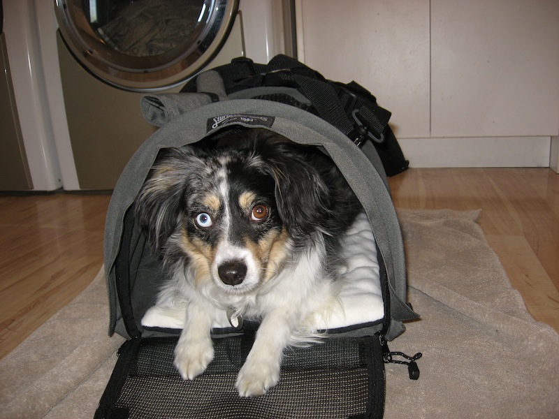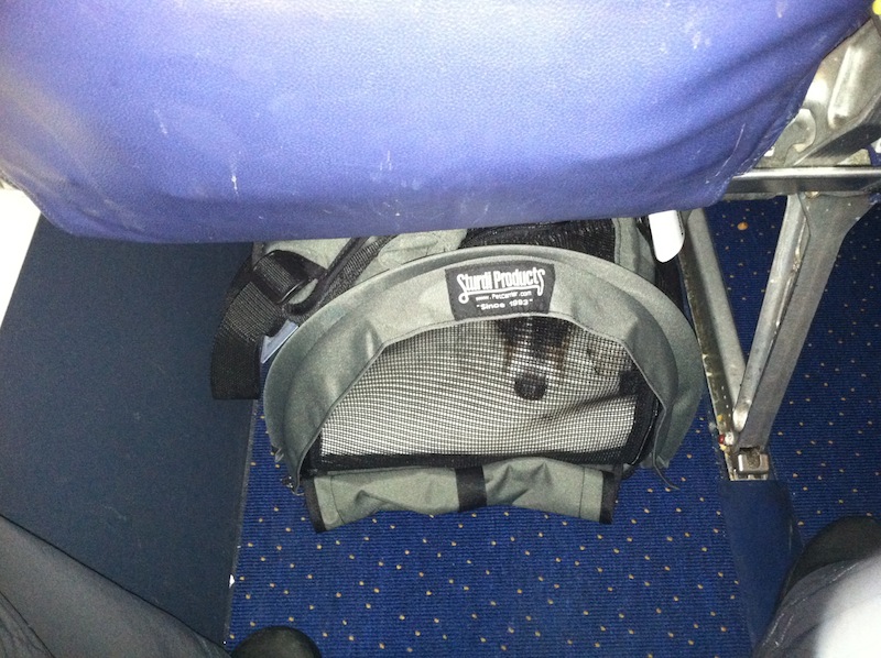 It’s a good thing that airport security doesn’t screen for high pulse rates, because I was so nervous to get everything right, that I was amazed I didn’t keel over right there in line after throwing my shoes in the plastic bin. Many, many thanks to the website Dog Jaunt for all the fantastic information on flying with a small dog, and my husband for getting me through check in. I knew my carrier (a large SturdiBag) would fit perfectly on a Southwest 737, and indeed, it did. Dunc was a fantastic little traveler, and fit in his little bag just fine thanks to his ability to bend like a wet noodle.