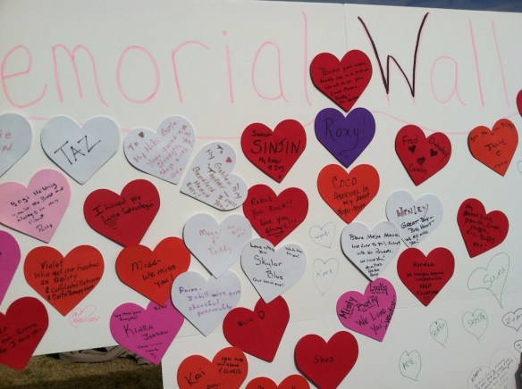 On Sunday, they stopped the trial, and smack in the middle of the rings, the Foundation held a ceremony to celebrate those buddies we’ve lost to this disease. They read the Rainbow Bridge poem, and one of the foundation’s founders asked me to place Sinjin’s heart on the wall first, quickly followed by dozens of other hearts. It was an amazing moment, standing there, tears streaming down my face, in a crowd of people doing the same. Not one person there was ashamed of crying visibly for friends we had lost, and I had one of those beautifully clear life moments. These are my people, and I’m so proud and thankful to have been among them on this special day.