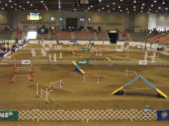 We arrived on Thursday to find three identical courses set on the floor of the rodeo arena. (With a fourth course set in an adjacent arena in another building). At that moment, gazing across the immense space, I realized what a huge deal this was, and was simply happy to be there, having earned the opportunity to run here with Duncan.
